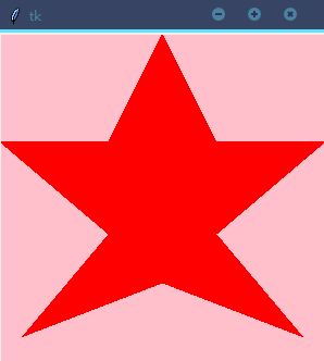 import tkinter class TK: def __init__(self): self.window = tkinter.Tk() self.canvas = tkinter.Canvas(self.window,width = 300,height = 300,bg = 'pink') self.canvas.create_polygon(150,0,200,100,300,100,200,185,280,280,150,230,20,280,100,185, 0,100,100,100,fill ='red') self.canvas.pack() tkinter.mainloop() m = TK()