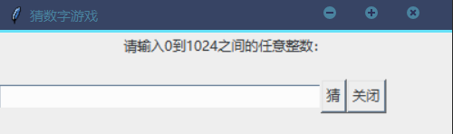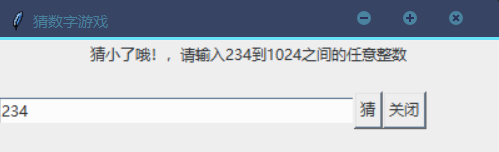 使用Tkinter开发一个猜数字游戏,运行效果如图所示。游戏中电脑随机生成1024以内数字,使用者去猜,如果猜得数字过大过小都会进行提示并把范围缩小,程序要统计玩家猜的次数,最后提示猜测次数。