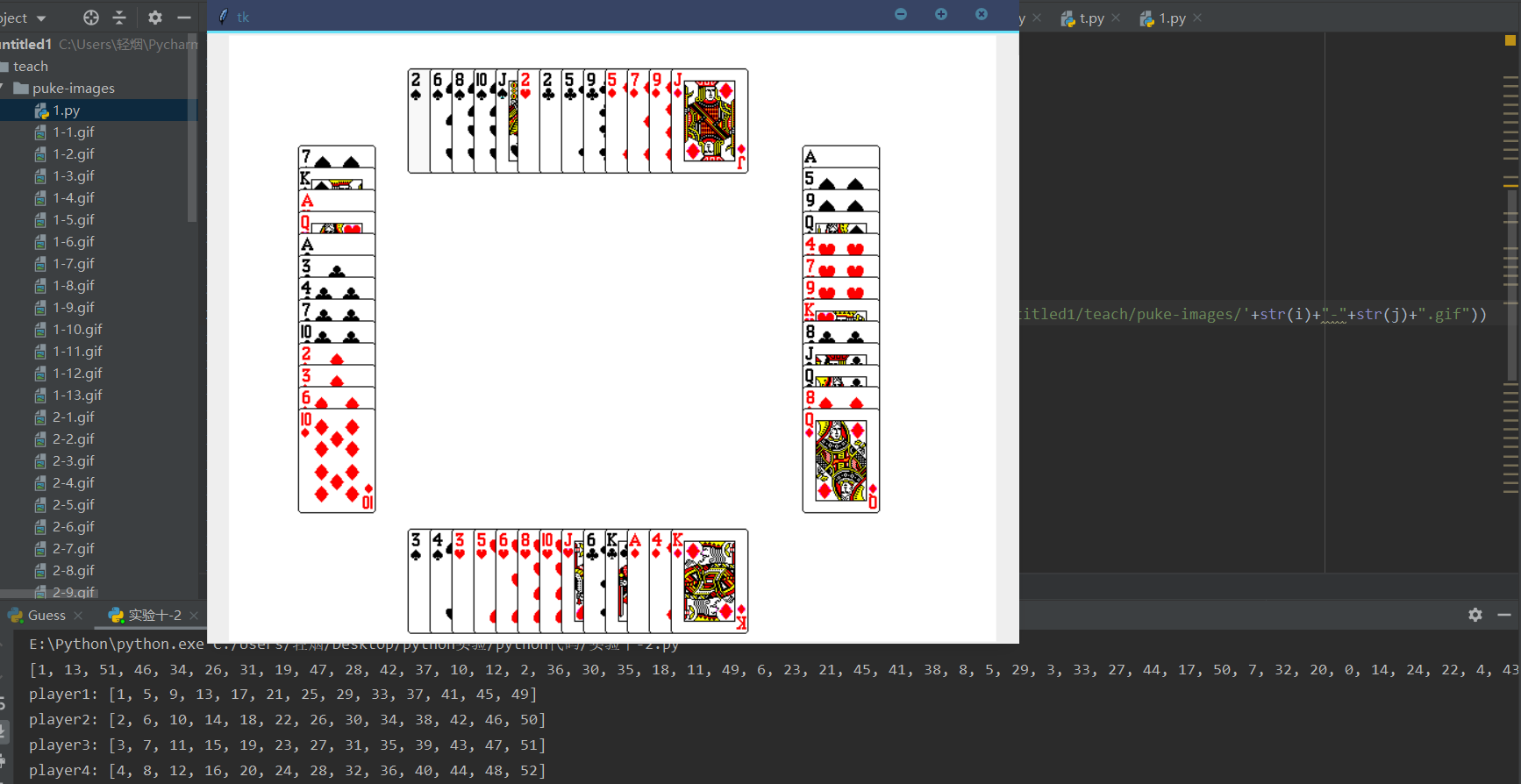 root.mainloop()这个题目的实现原理我们在前面的例题中已经分析过,在这里我们只要注意我们使用了图形界面去把每张牌的数字去对应每一个图片,然后我们在通过canvas控件的定位功能把所有的牌在画布中显示出来,使用的过程中一定要注意图片的路径问题。