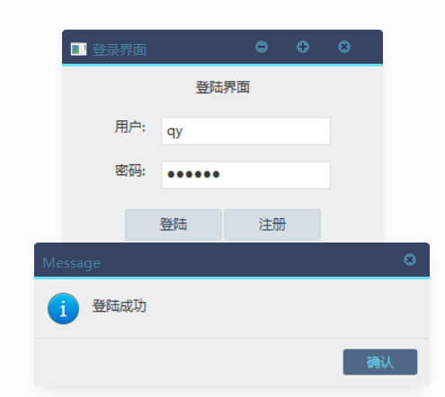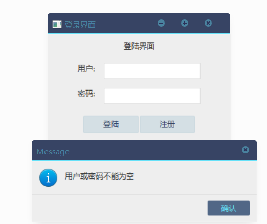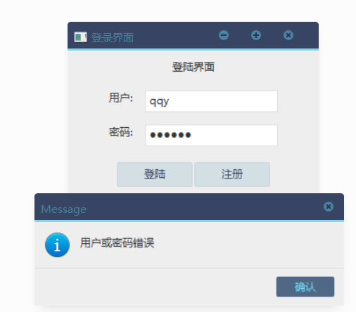 import wx class MyFrame(wx.Frame): def __init__(self): wx.Frame.__init__(self, None, -1, "登录界面", size=(300, 300)) panel = wx.Panel(self)#创建一个画布,然后创建功能区并放到画布上 self.title = wx.StaticText(panel,label = '登陆界面') self.username = wx.StaticText(panel,label = '用户:') self.user_name = wx.TextCtrl(panel,style = wx.TE_LEFT) self.userpassword = wx.StaticText(panel,label = '密码:') self.user_password = wx.TextCtrl(panel,style = wx.TE_PASSWORD) self.button_login = wx.Button(panel,label = '登陆') self.button_login.Bind(wx.EVT_BUTTON,self.OnclickEventname) ...和上一节一致,在这里省略.... def OnclickEventname(self,event): ms = '' urnm = self.user_name.GetValue() pwd = self.user_password.GetValue() if urnm == '' or pwd == '': ms = '用户或密码不能为空' elif urnm == 'qy' and pwd == '123456': ms = '登陆成功' else: ms = '用户或密码错误' wx.MessageBox(ms) if __name__ == "__main__": app = wx.App() frame = MyFrame() frame.Show() app.MainLoop()