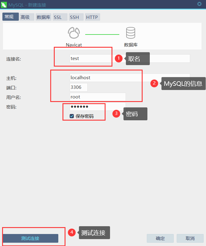 测试连接显示通过则连接成功,在这里一定要记得这个密码,改密码是件麻烦的事情,否则就需要重新安装MySQL。