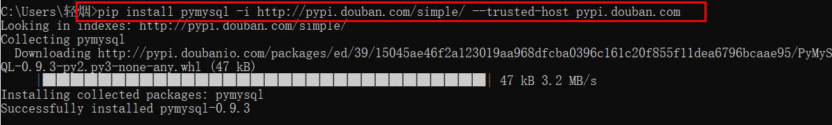 前面几节我们初步认识了数据库,我们想要把数据库连接到程序中,还是需要一个模块,我们使用PyMySQL模块来进行连接,安装它的命令为:pip install PyMySQL,如果安装失败可以使用下面的命令:pip install pymysql -i http://pypi.douban.com/simple/ --trusted-host pypi.douban.com安装完成如图所示。