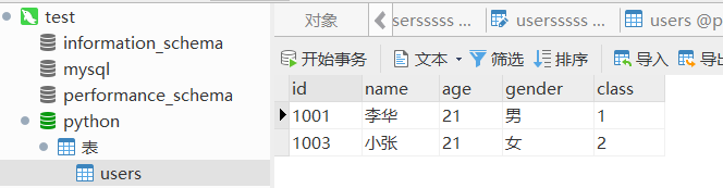 cursor.execute("insert into users(id,name,age,gender,class) values('1001','李华','21','男','1')")