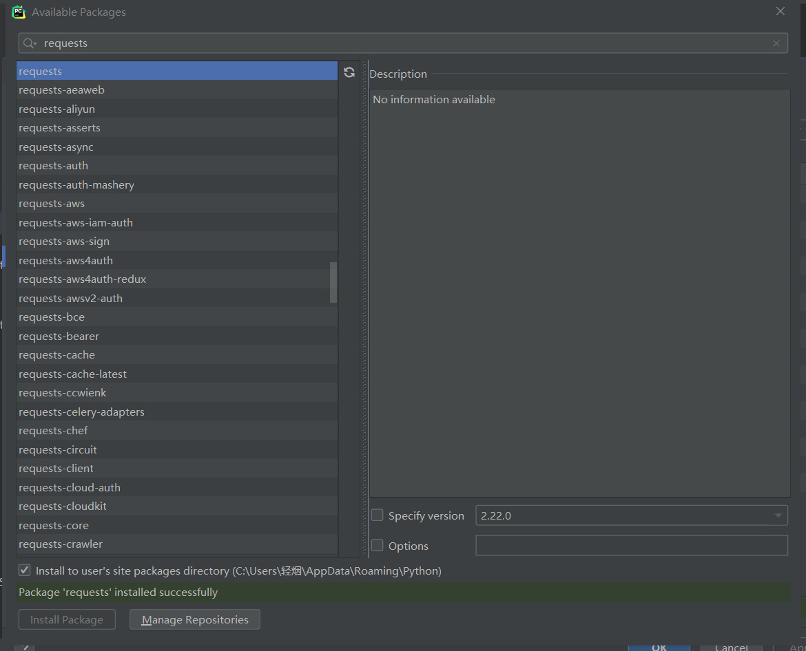 requests是一种第三方模块,主要用于发送请求,它在使用的时候比urllib模块要简洁方便很多,我们可以在命令操作符里通过pip install requests来安装,也可以在Pycharm中直接进行安装。