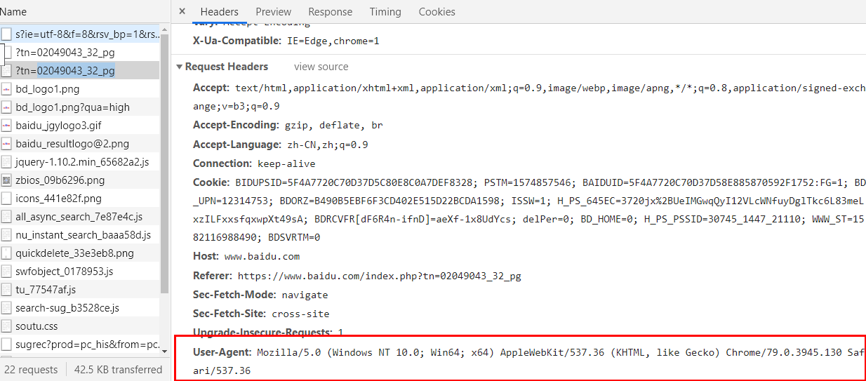 这个就为我们的头部信息,也就是我们当前访问此网站的用户信息,我们复制一下然后开始使用它,代码如下: