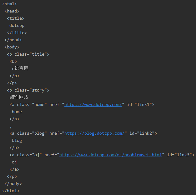 Dot = """ <html><head><title>dotcpp</title></head> <body> <p><b>c语言网</b></p> <p>编程网站 <a href="https://www.dotcpp.com/" id="link1">home</a>, <a href="https://blog.dotcpp.com/" id="link2">blog</a> <a href="https://www.dotcpp.com/oj/problemset.html" id="link3">oj</a></p> """ from bs4 import BeautifulSoup soup = BeautifulSoup(dot, "html.parser") print(soup.prettify())