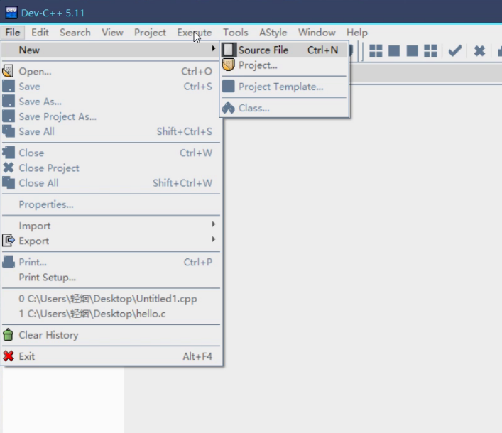 初步使用这款软件,我们先选择源文件进行创建,打开软件后点击左上角的File->New->Source File,也可以使用快捷键Ctrl+N进行创建。