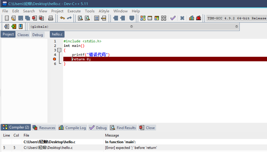 我们可以从图中看到第五行代码出了问题,在return前面缺少了一个‘;’,即使点击编译并执行也会出现相同的情况。