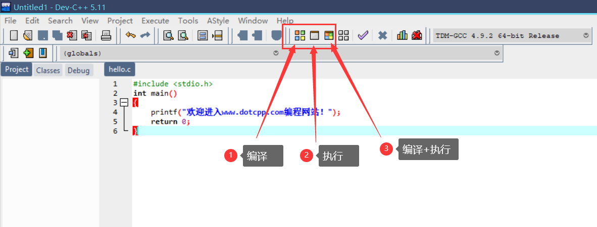 编译是程序执行的前提,可以通过F9直接快捷编译,也可以点击图中按钮进行编译编,后面的按钮是执行按钮,一定要注意编译之后才能执行,也可以直接点击编译并执行的按钮。