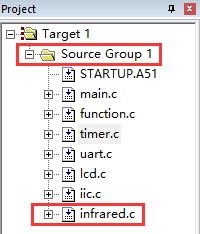 因为主函数中只需要使用“InitInfrared();”函数来初始化,而“unsigned int GetHighTime()”和“unsigned int GetLowTime()”都是只在“void EXINT1_ISR() interrupt 2”中使用,所以头文件不用声明这三部分的函数。