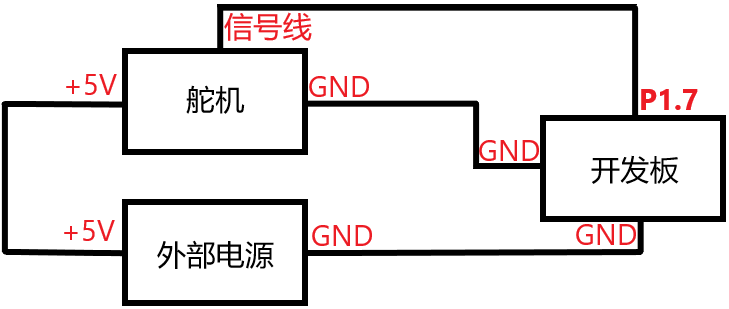 }我们把上一章测试AD,DA所拔下的跳线帽插回去先。开发板底部中间处有一个电位器,大家用一字螺丝刀来旋转电位器就可以观察到舵机桨跟着旋转了。此外舵机的电源供电最好使用外部电源,用开发板来给舵机供电会导致液晶屏失压闪烁,而且舵机的稳定性也不是很好,笔者测试的时候是使用另外的5V电源电压给舵机供电,连接图如下