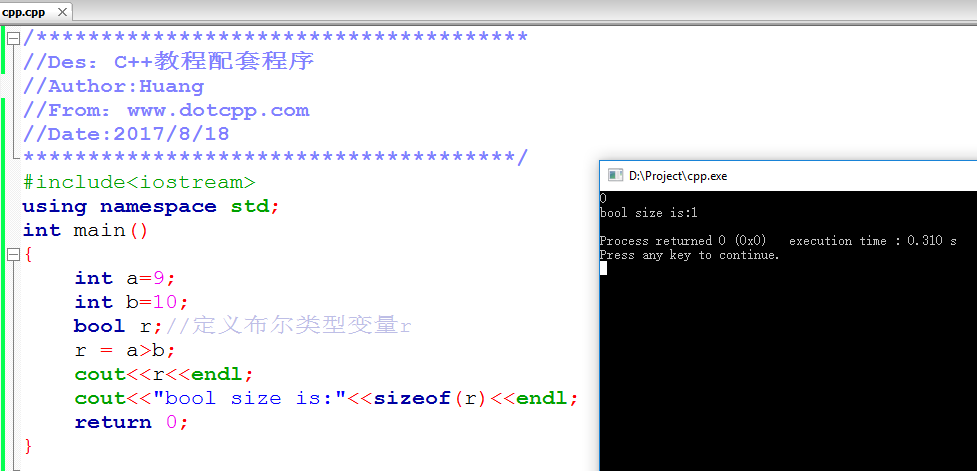 布尔类型是一种逻辑值,关键字类型为bool,定义出来的变量只有true和false两个,分别表示真和假两个值,在内存上一般只占一个字节。C++中bool类型的出现,对于想表达真假逻辑结果的值,再适合不过,填补了C语言中只能用int来替代的不足,下面请看例子程序: