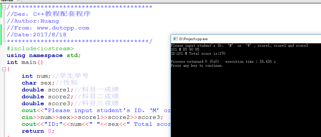 cout<<"ID:"<<num<<" "<<sex<<" Total score is:"<<score1+score2+score3<<endl;//输出该学生信息及总成绩