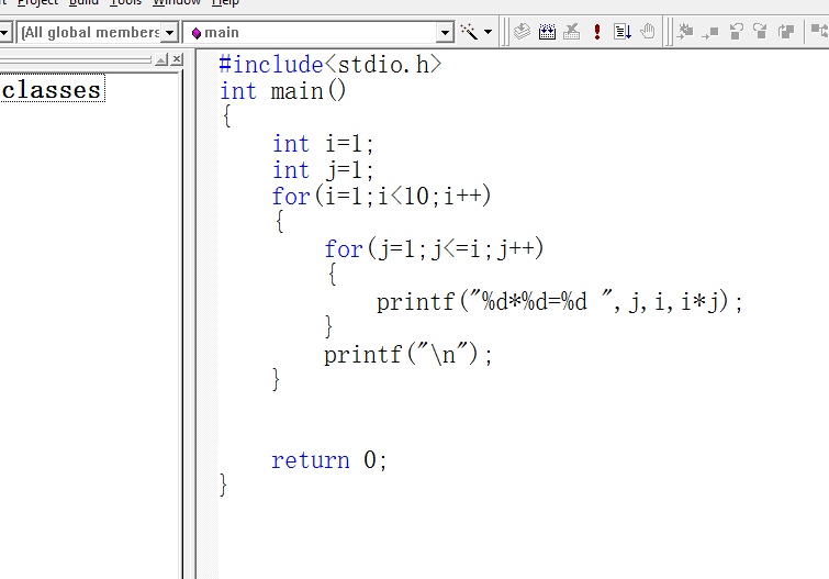 来一个具体的程序例子:打印九九乘法表程序,代码如下: