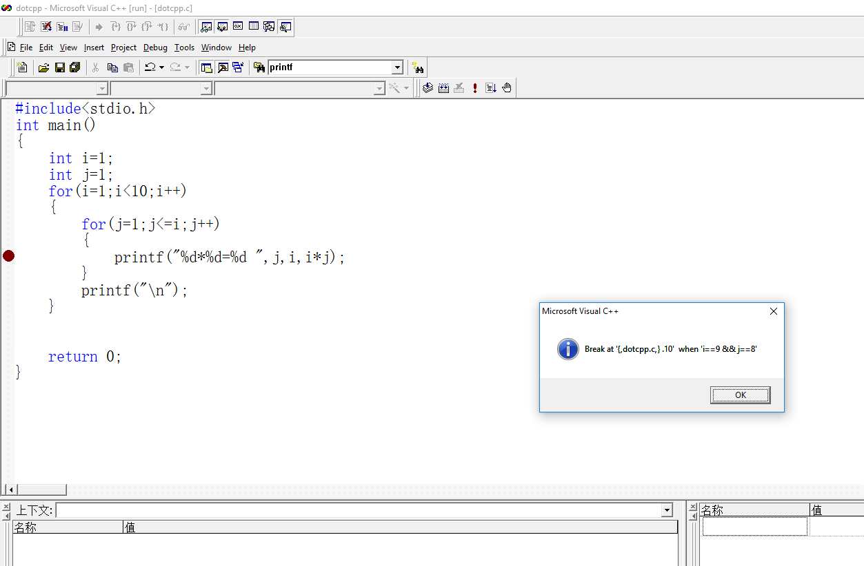 首先在printf输入语句处F9下断点!(注意这个断点一定要在i和j在满足8和9的时候可以触发处,不然即使条件满足也将无法触发断点。)