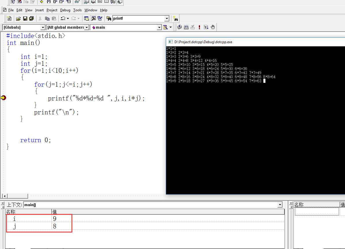 比如我们想在打印8*9=72这个结果时候断点停止,如果单步运行显然要按70多下F10… 这个时候无疑条件断点将是很好的选择!具体如下: