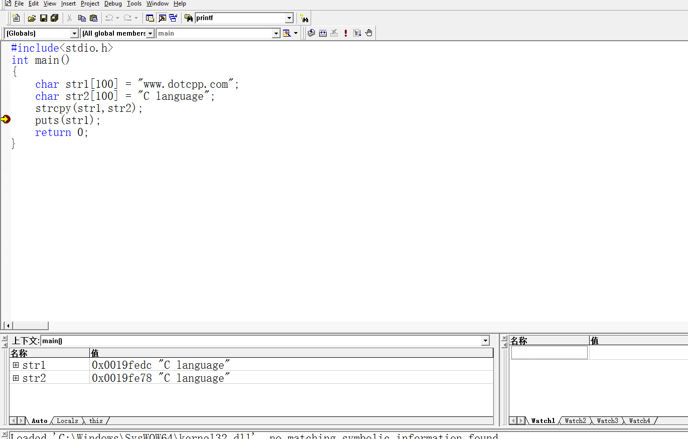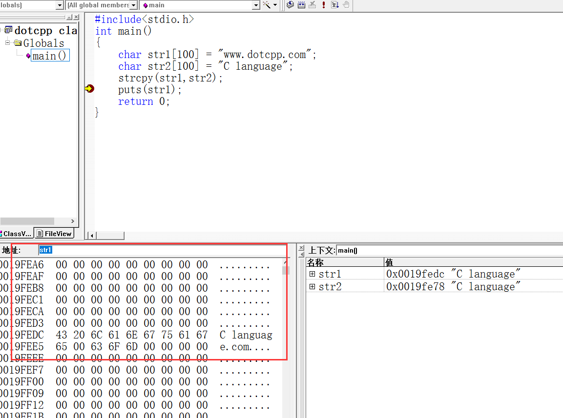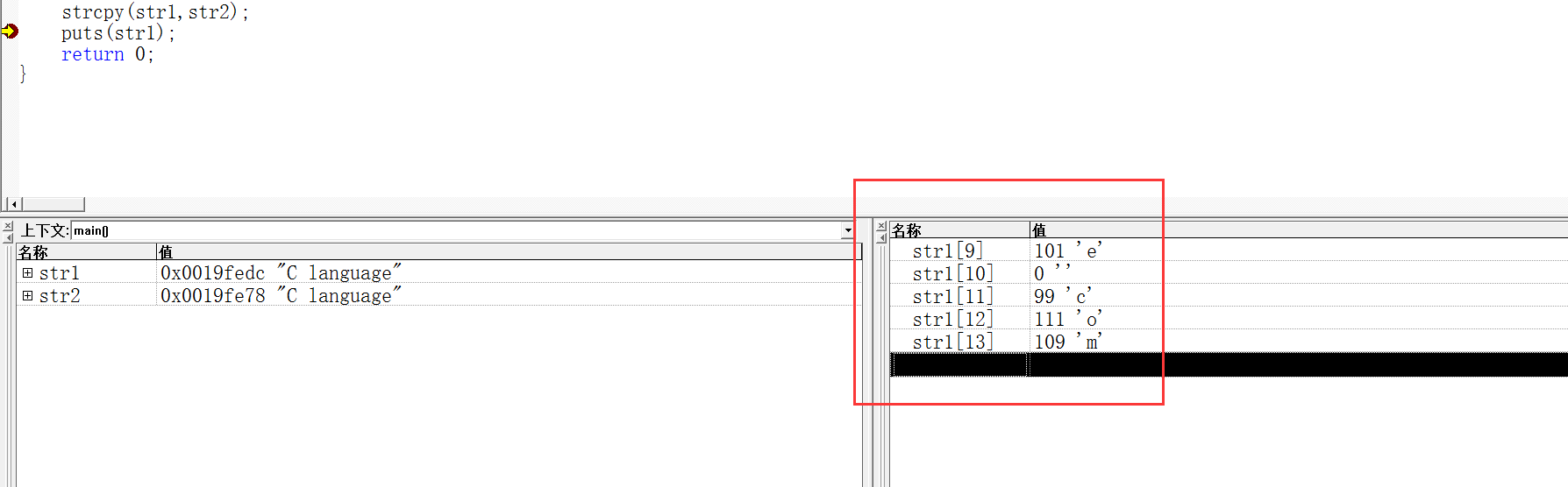 }我们想查看strcpy函数过后str1数组中的值,而puts仅仅会显示覆盖后的,如果我们想看后面没有输出的字符,那么最好就要内存监视了,方法如下: