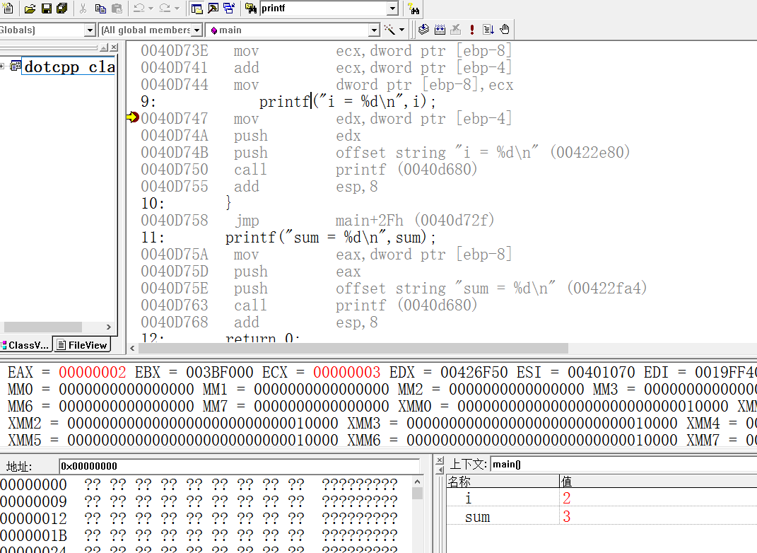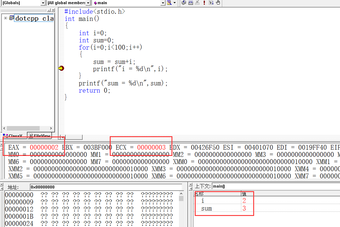 例如一个累加求和程序,通过断点监视寄存器观察如下: