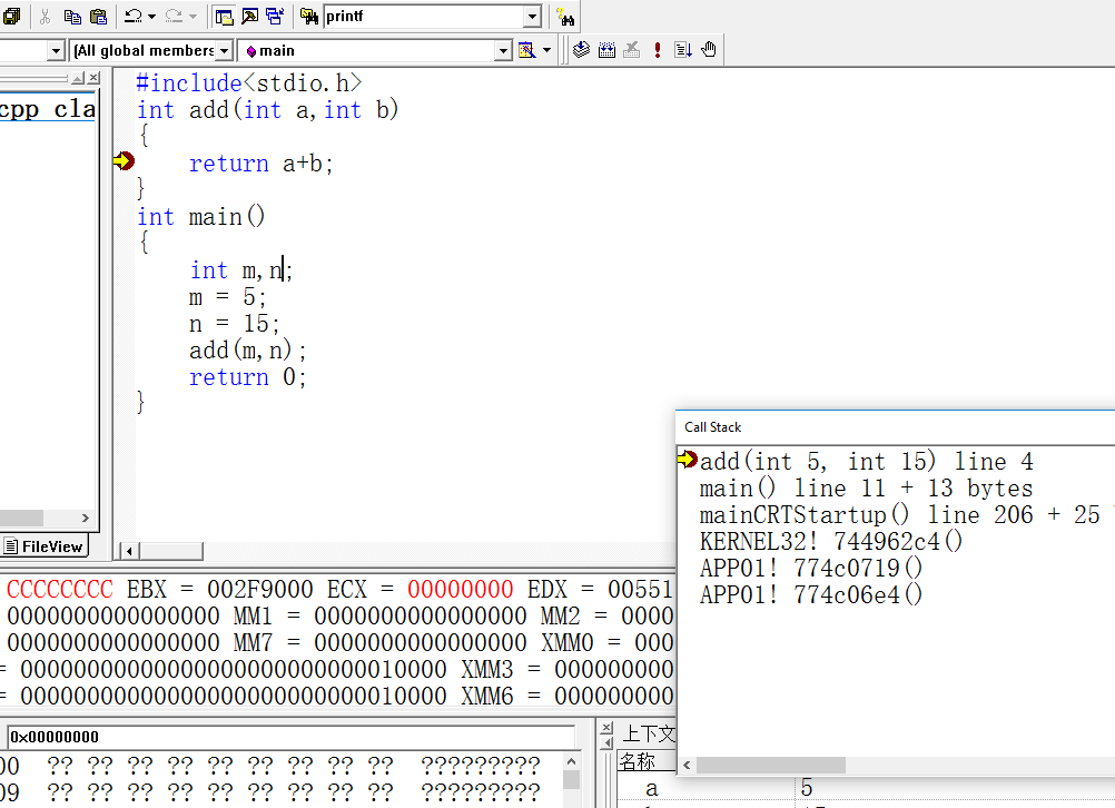 我们在学习函数调用,以及C程序的真正入口 函数时就可以利用VC6编译器提供的栈回溯功能,来查看函数调用过程,方法是在调试环境下选择View – Debug Windows – Call Stack 快捷键Alt+7例如我们写一个例子程序,可以尝试此功能: