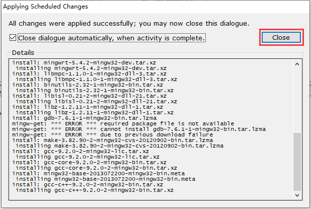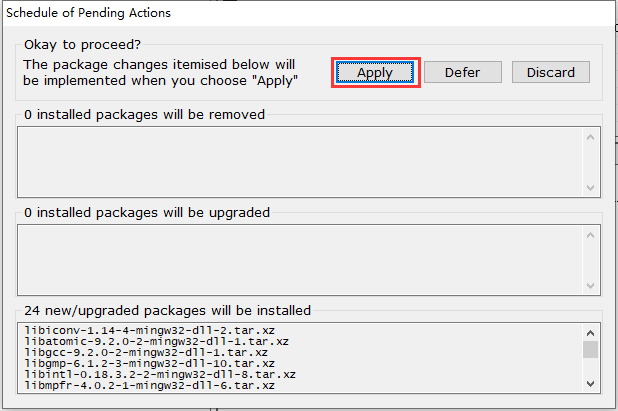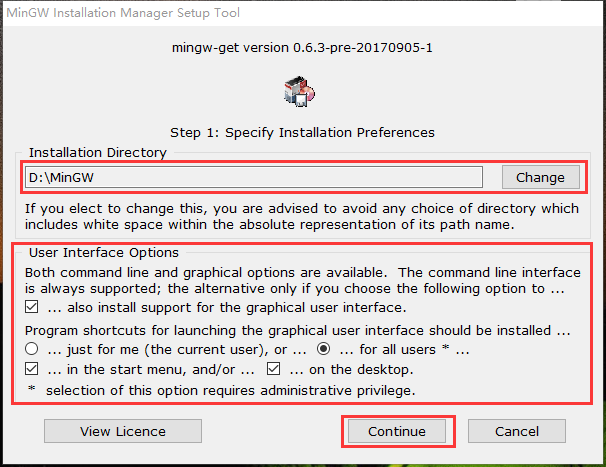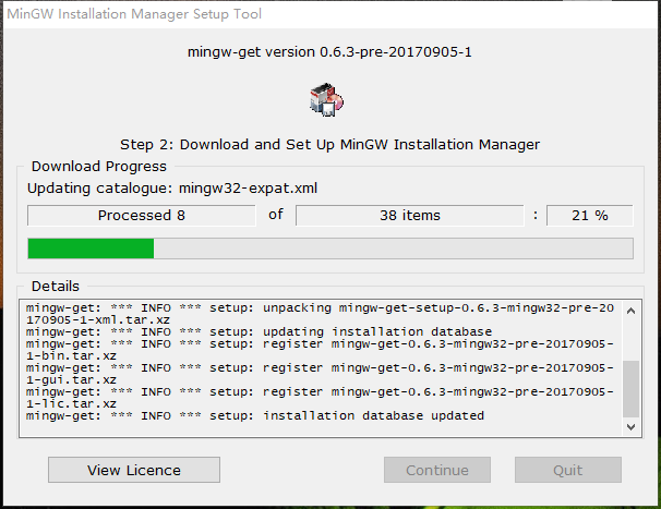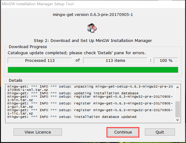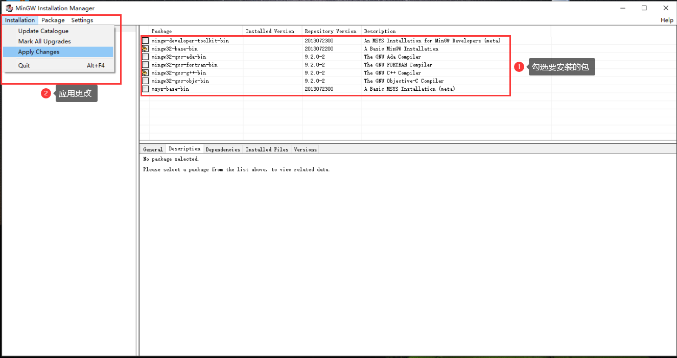 第六步,当100%完成后,桌面上会得到一个MinGW Installer Manager的软件,用于管理安装,我们按照如下选项,然后