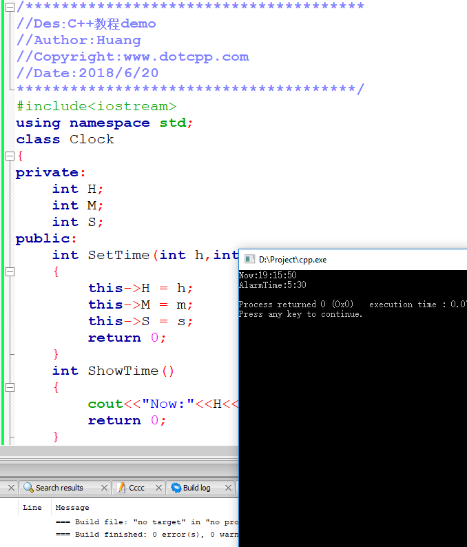 通过冒号表示继承,其中public表示公有继承、私有继承和保护继承,我们会在后面慢慢展开。代码中,我们在主函数里定义了AlarmClock这个派生类的对象A,然后可以调用来自基类的SetTime和ShowTime方法,使用起来自己的一样。同时,我们又在派生类中增加定义了自己的SetAlarm和ShowAlarm方法。请大家理解代码并上机实验。