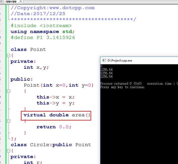 接下来,我们只需要把基类中的area方法声明为虚函数,那么主函数中无论Point类型的指针还是引用就都可以大胆调用,无用关心类型问题了。因为他们会依据实际指向的对象类型来决定调用谁的方法,来实现动态联编。