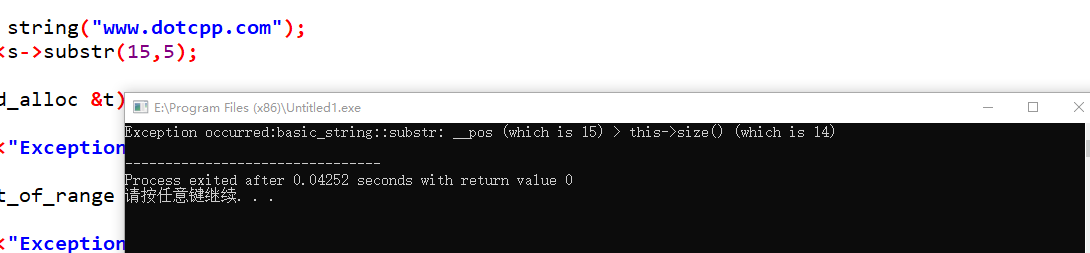 4. 我们在使用string类下标但越界时,则抛出out_of_range异常。