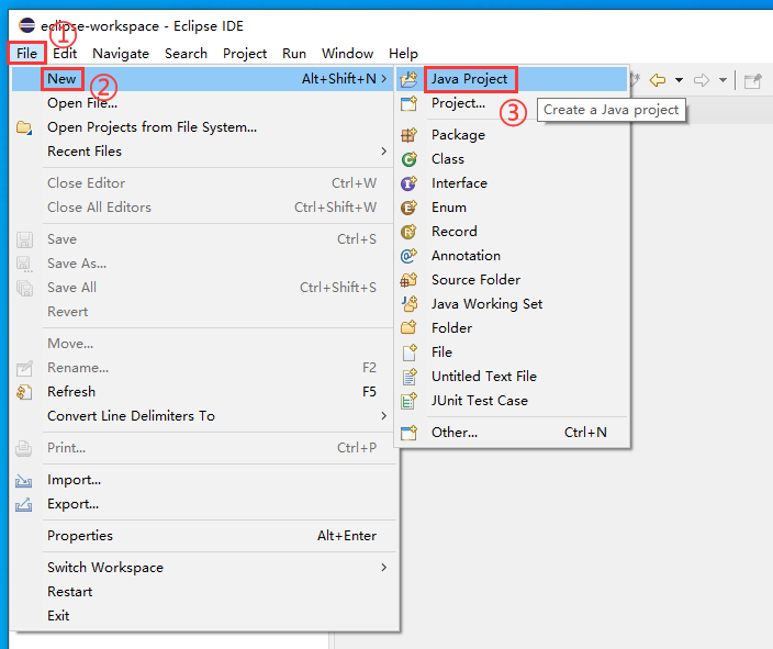 ① 在Eclipse菜单栏选择【File】>【New】>【Java Project】。