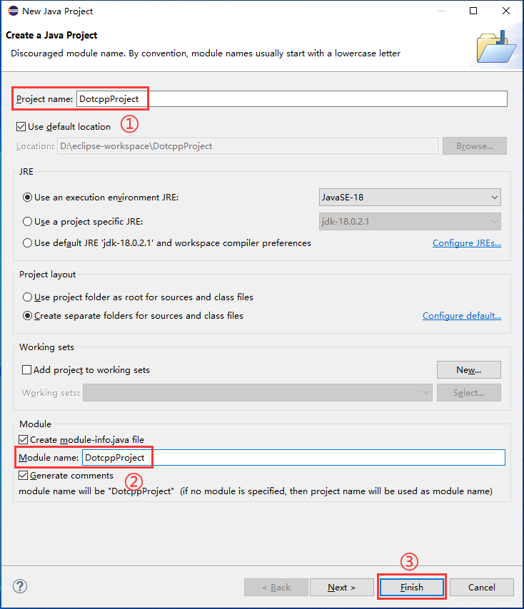 ② 在弹出来的窗口中,在【Project name】输入框中输入工程名,例如【DotcppProject】,在【Module name】输入框中输入模块名,若模块名不写则默认与工程名同名,然后点击【Finish】。
