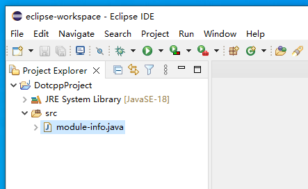 ③ 创建完成后,在左侧项目浏览器【Project Explorer】中会显示你创建的工程文件夹,其中包括一个JRE系统库(JRE System Library)和一个src文件夹(项目源文件存放的地方)。
