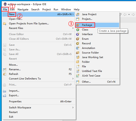 ① 在Eclipse菜单栏选择【File】>【New】>【Package】。