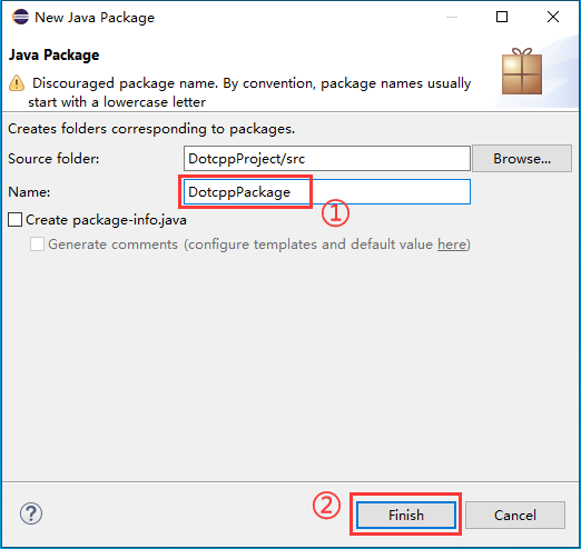 ② 在弹出来的窗口中,在【Name】输入框中输入包名,,例如【DotcppPackage】,然后点击【Finish】。