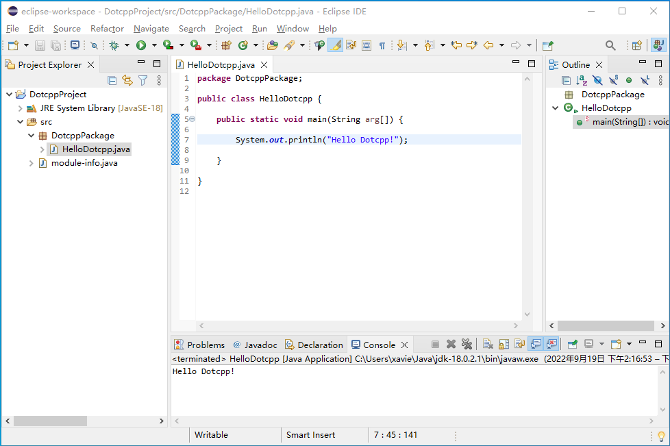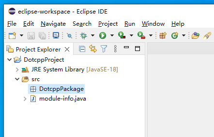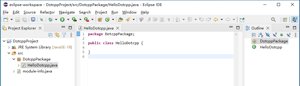 ③ 创建完成后,在刚才创建的DotcppPackage包中会出现你创建的HelloDotcpp.java源文件,并在主界面中自动生成了几行HelloDotcpp类的基础语句。