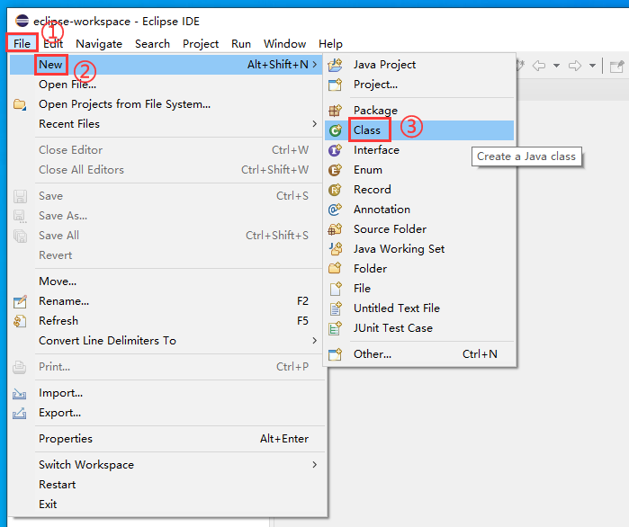 ① 在Eclipse菜单栏选择【File】>【New】>【Class】。