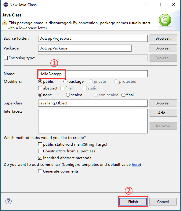 ② 在弹出来的窗口中,在【Name】输入框中输入类名,例如【HelloDotcpp】,然后点击【Finish】。
