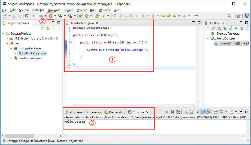 ① 在类文件HelloDotcpp.java中将代码补全(下图以输出“Hello Dotcpp!”为例),然后点击菜单栏中的【Run】图标进行编译执行,执行结果将显示在底部【Console】窗口中。