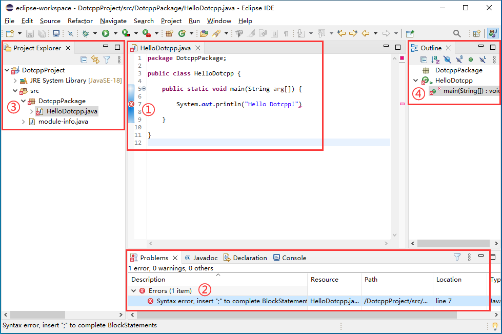 ② 若代码有误,在Eclipse的多个视窗都会显示错误信息。比如在【HelloDotcpp.java】类文件的窗口中,在有问题的代码的行号前会出现红色叉图标;在底部【Problems】窗口中,会显示详细的错误信息,比如错误数量、错误描述、错误文件地址、错误行号等;在【Project Explorer】项目浏览器中,出错的类文件、包、项目源文件夹、项目的图标下方会出现红色叉图标;在【Outline】视窗中,有问题的成员变量及方法的图标下方也会出现红色叉图标。