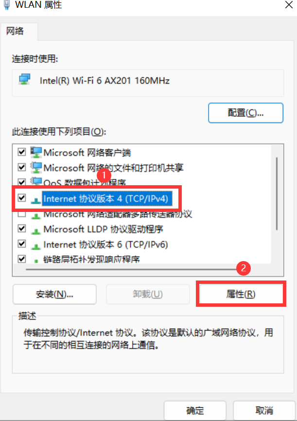 4)单击Internet协议版本4(TCP/IPv4),然后点击属性