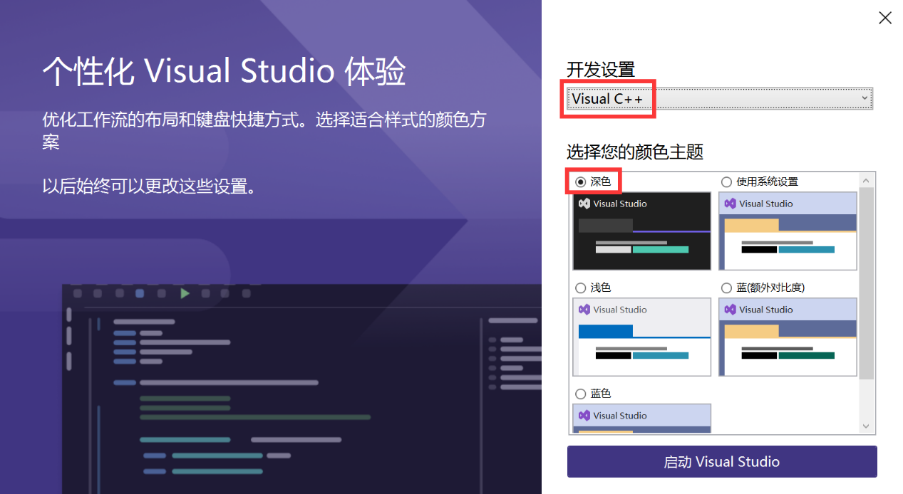 5)配置vs2022,开发设置可以选择Visual C++,也可以使用默认的常规,区别不大,颜色等也可以依据自己的爱好进行选择
