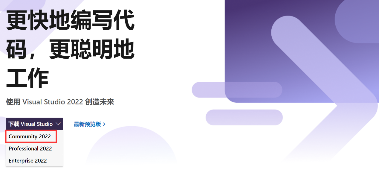 下载地址为:Visual Studio 2022 IDE - 适用于软件开发人员的编程工具 (microsoft.com)