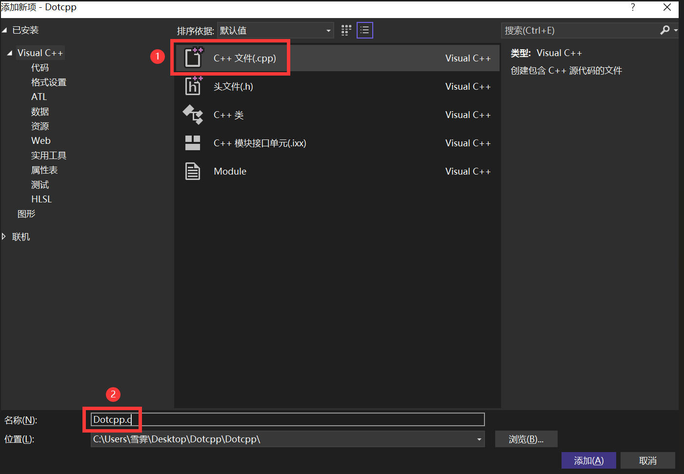 5)选择c++文件,需要将名字的后缀.cpp修改为.c,然后点击添加