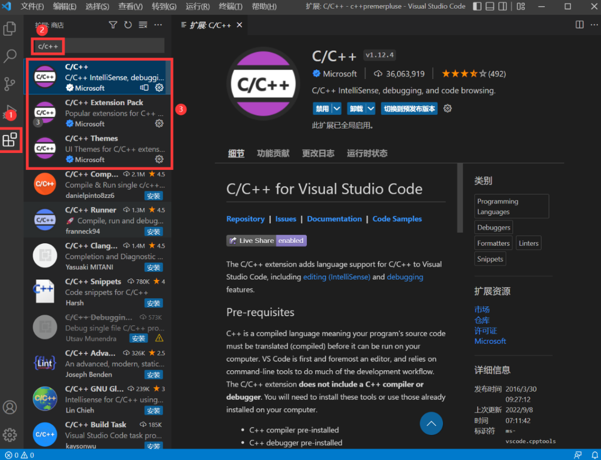 2)配置C语言环境,在左侧扩展搜索中搜索C/C++,将图中三个插件安装即可
