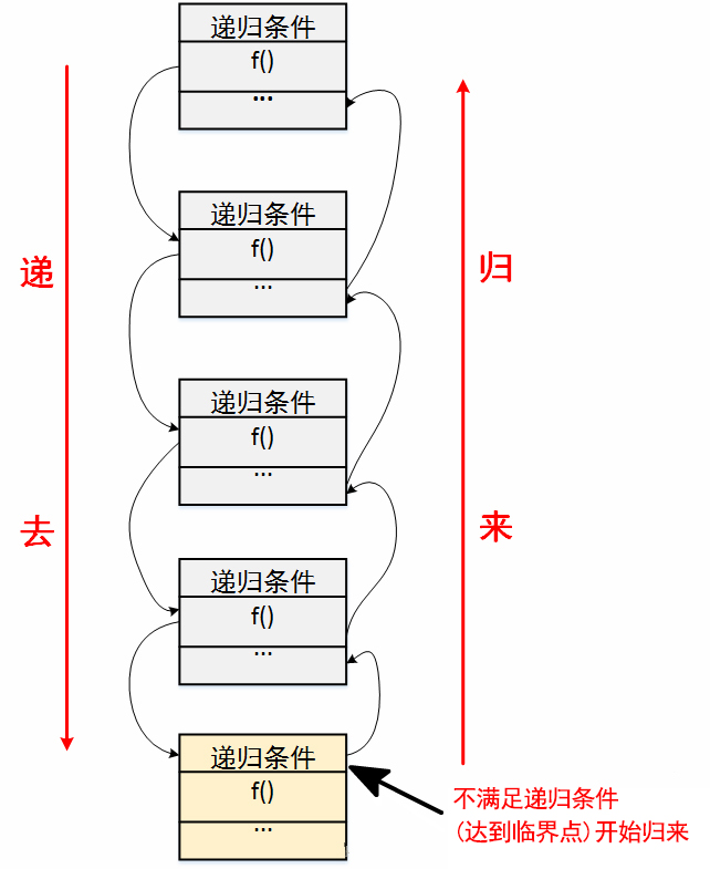 递归算法,顾名思义就是有两个大的阶段:递和归,即就是有去(递去)有回(归来)。