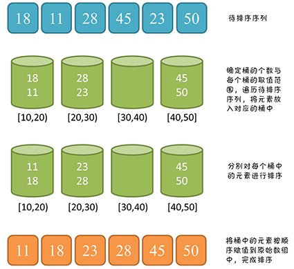 对于待排序序列大小为 N,共分为 M 个桶,主要步骤有: