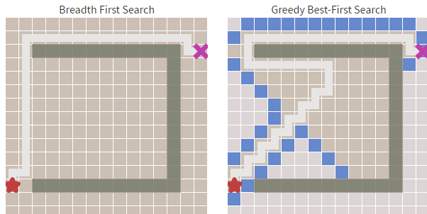明显看到右边的算法(贪婪最佳优先搜索 )寻找速度要快于左侧,虽然它的路径不是最优和最短的,但障碍物最少的时候,他的速度却足够的快。这就是贪心算法的优势,基于目标去搜索,而不是完全搜索。
