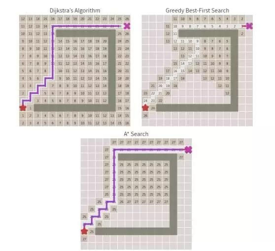 A star算法、贪婪最佳优先、Dijkstra算法三者的静态效果图如下: