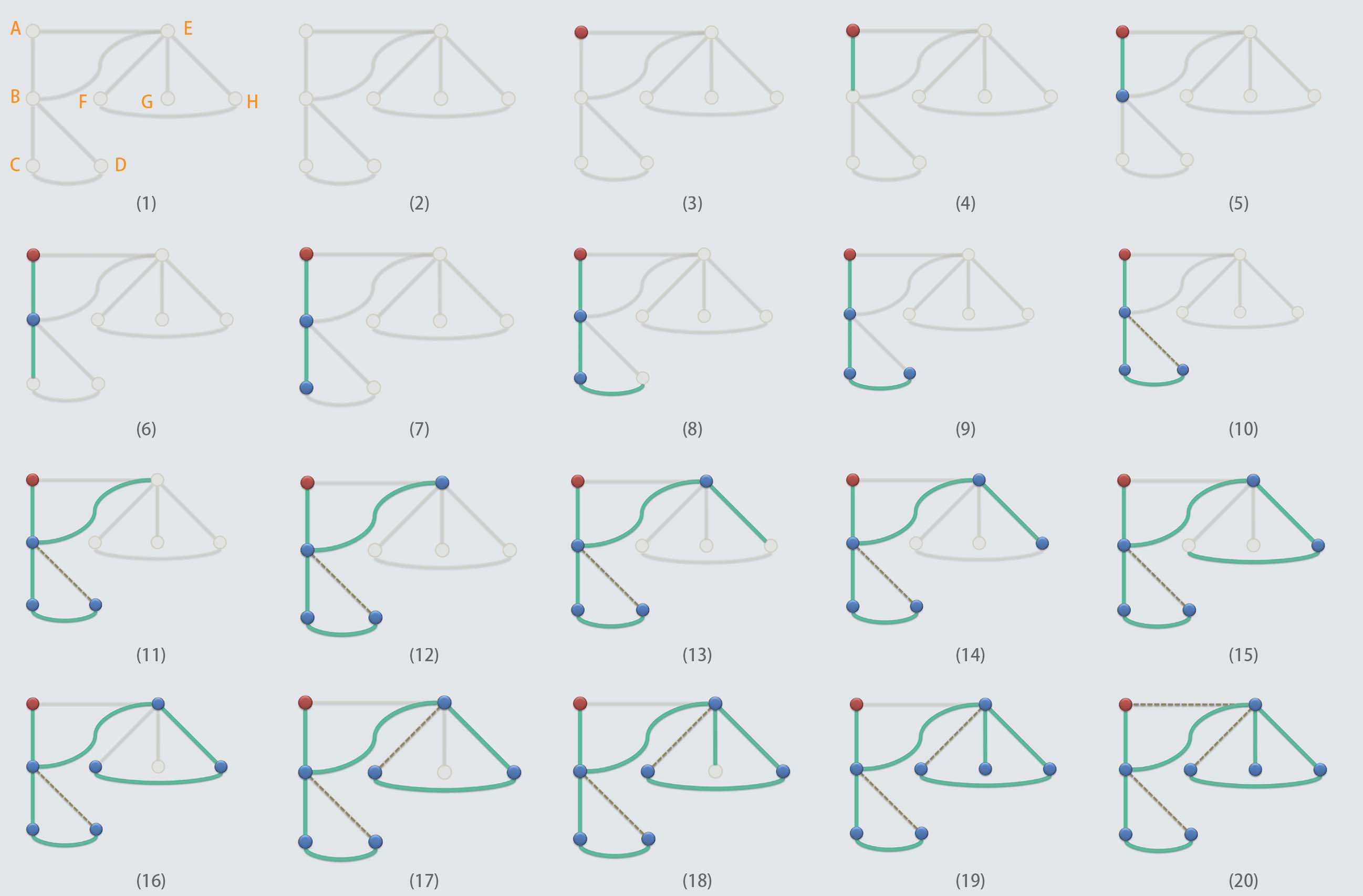 ● 继续做回退,当到达E点的时候,发现又可以往前走,最终到达一个死胡同,如图19所示,这样只能继续回退一直到初始红点A