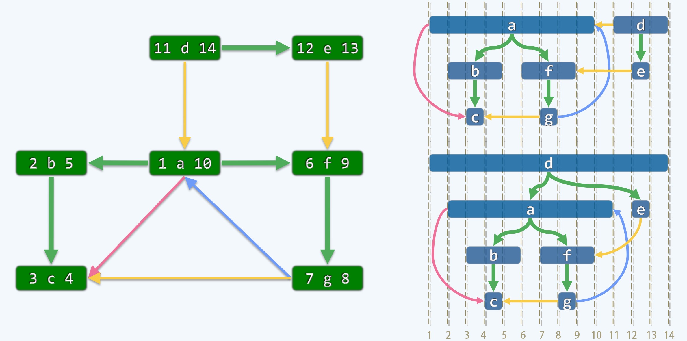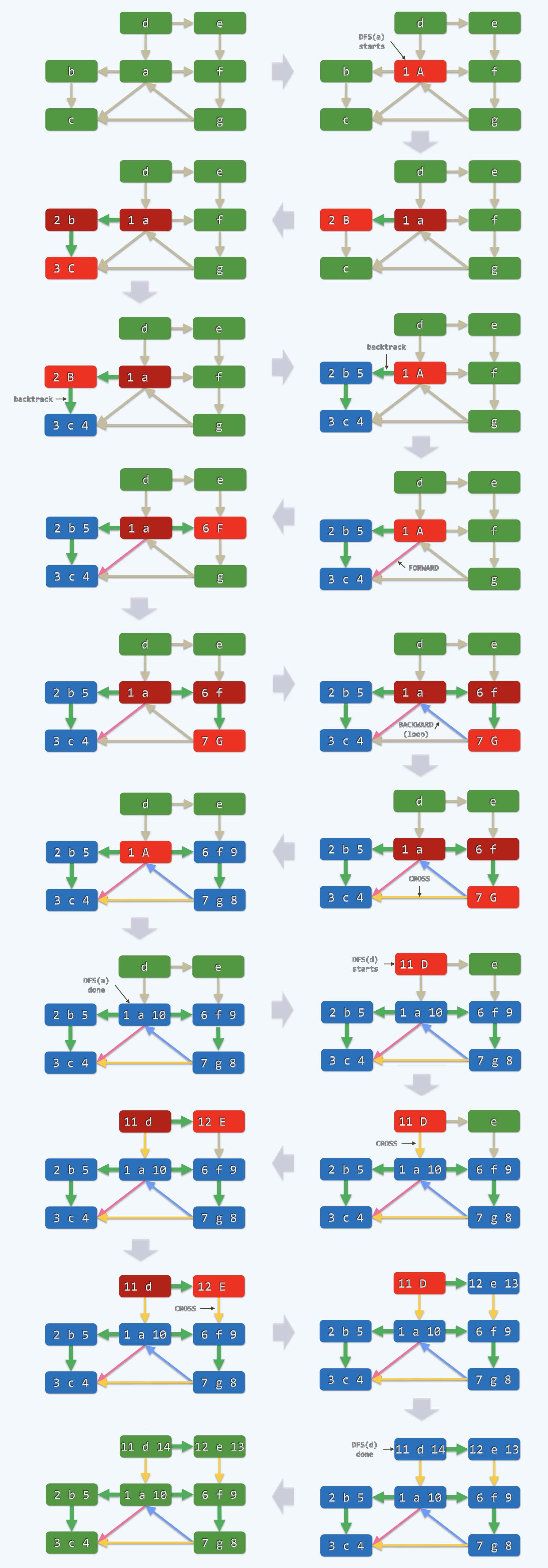 }我们可以看到上述算法中有4种边:TREE、FORWARD、BACKWARD、CROSS, 下面我们会详细来说明