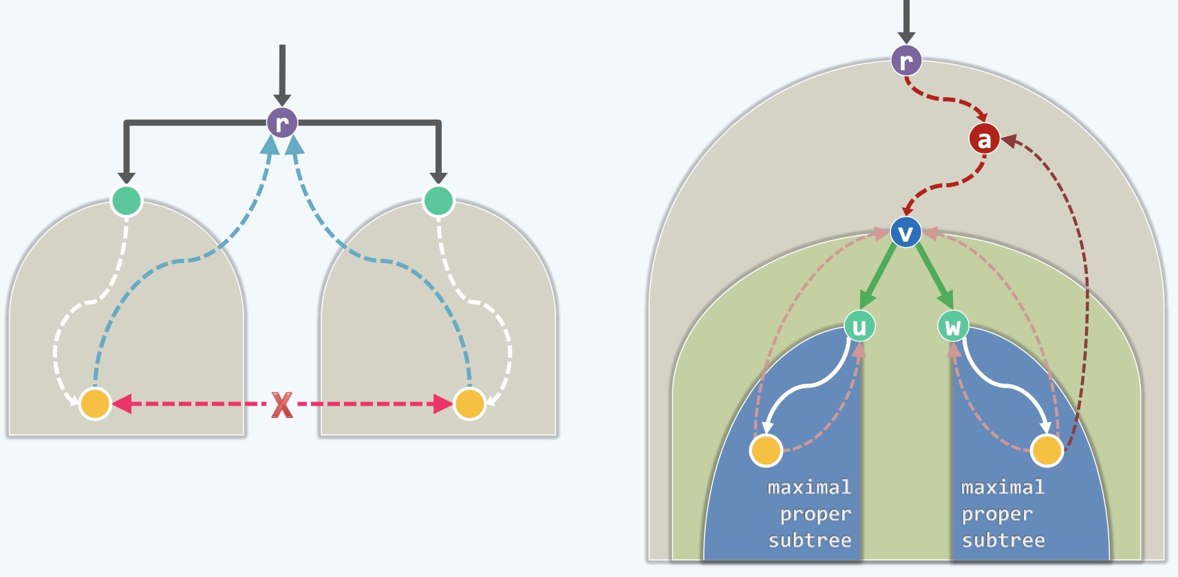 ● 不失一般性,我们取内部节点v,v点到根节点r必然有唯一的一条路径,如深红色的虚线路径