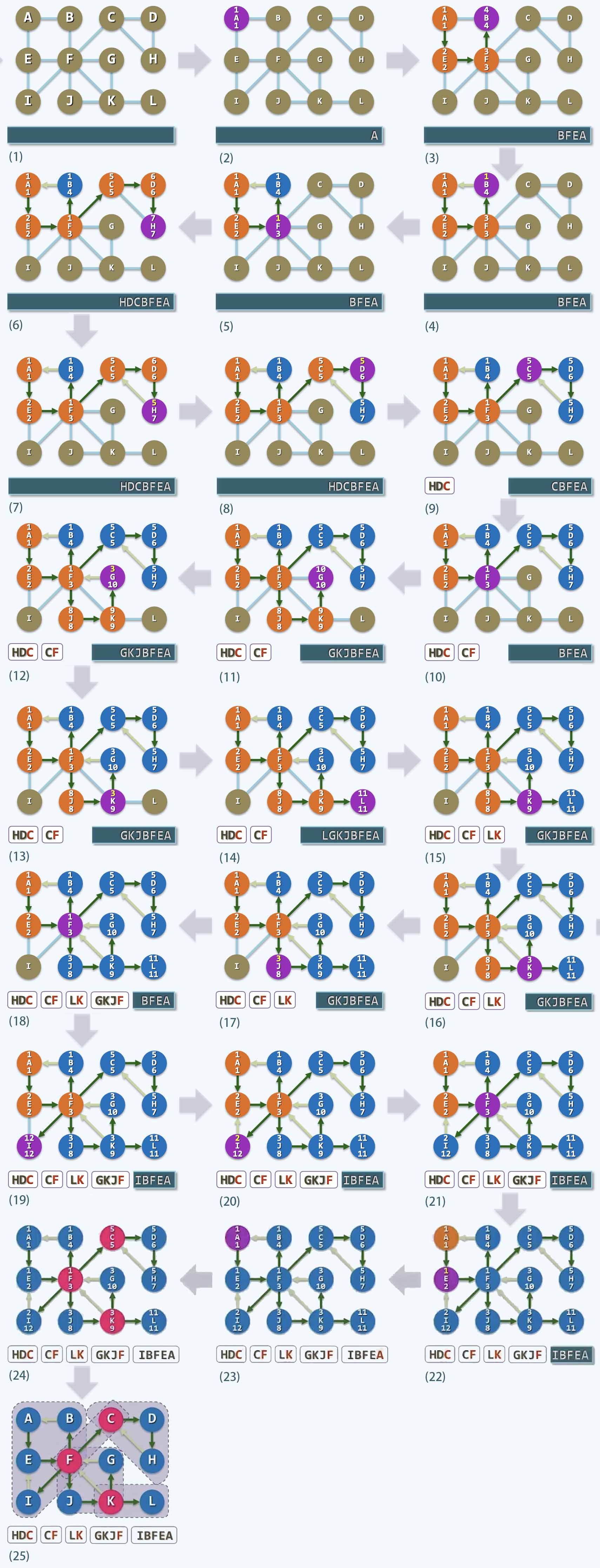 (12)同理,继续进行回溯,从b到a,a从暗红变为鲜红,a还有邻居,如c,f, 如果选择邻居c, 那么这时候就有意思了